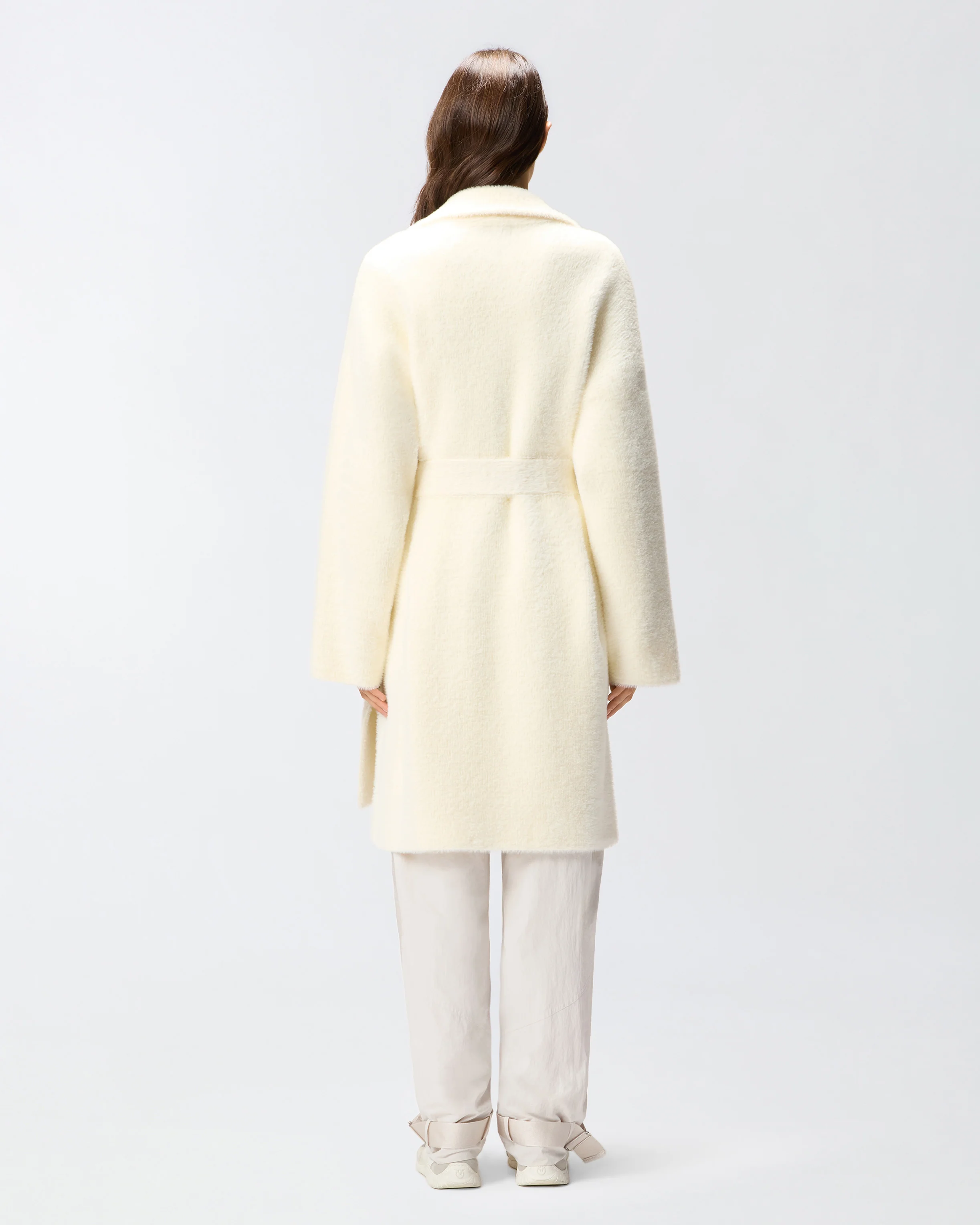 Soft Aspen fabric coat, designed to elevate your winter wardrobe. Wrap yourself in elegance thanks to this practical design: close the coat with the belt and metal star-decorated buttons, which also embellish the two side pockets. The piece has undergone finishing tests to minimise the possible formation of pilling, ensuring greater fabric softness and durability. Understated but striking, this style will become the undisputed star of all your outfits, whatever the occasion.