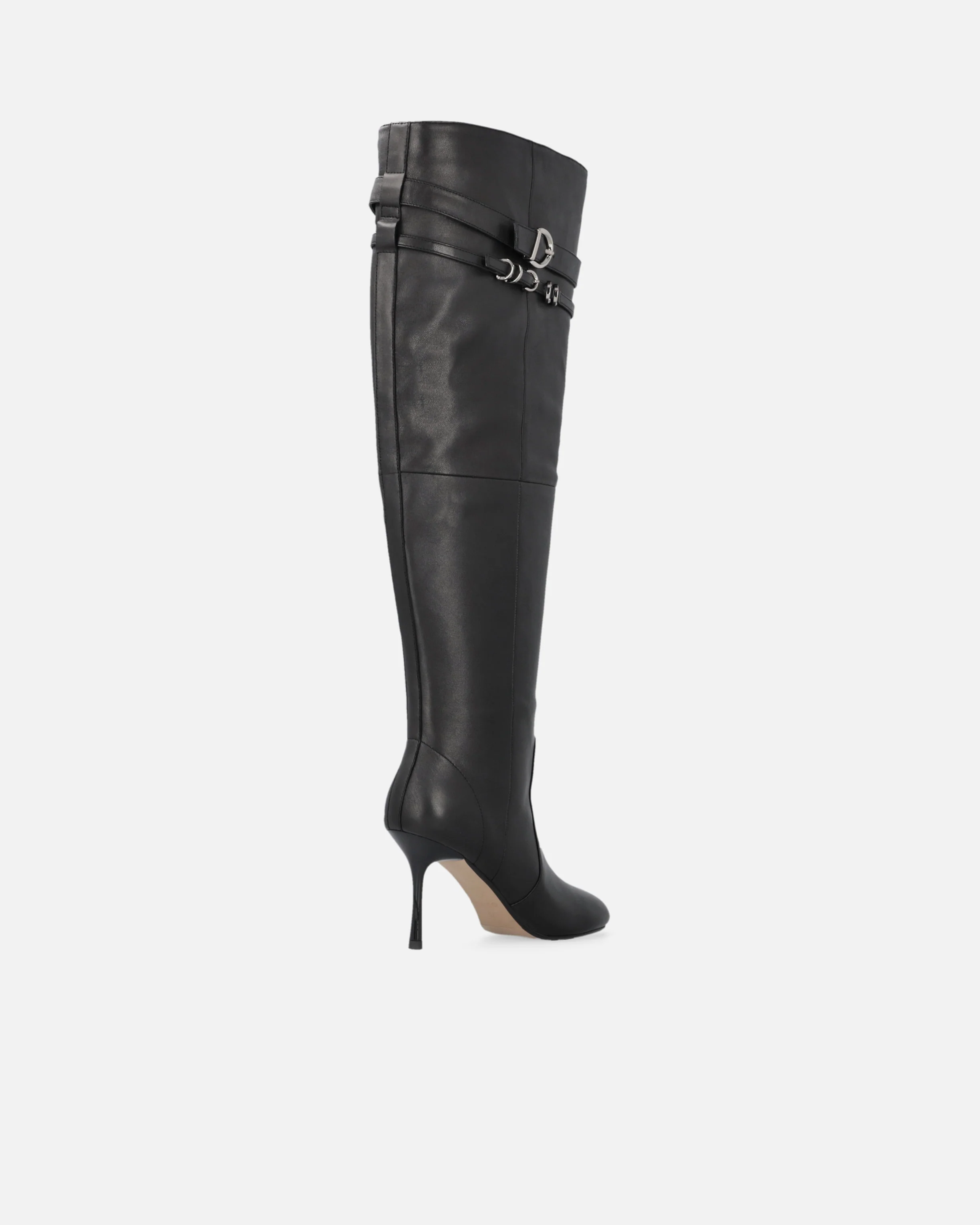 Knee-high boots in soft, smooth fine nappa leather, featuring a leg shaft with an inner zip to help put them on and a refined, metal ring-adorned strap. The rounded toe and slender 8.5cm-high heel give these shoes a bold, feminine look. The boots have leather inner lining, a leather insole with light padding and a sole made from tunit, a synthetic material with properties very similar to those of leather. These boots pair perfectly with midi dresses for a more boho-chic look, as well as giving elegant special-evening outfits a bold touch.