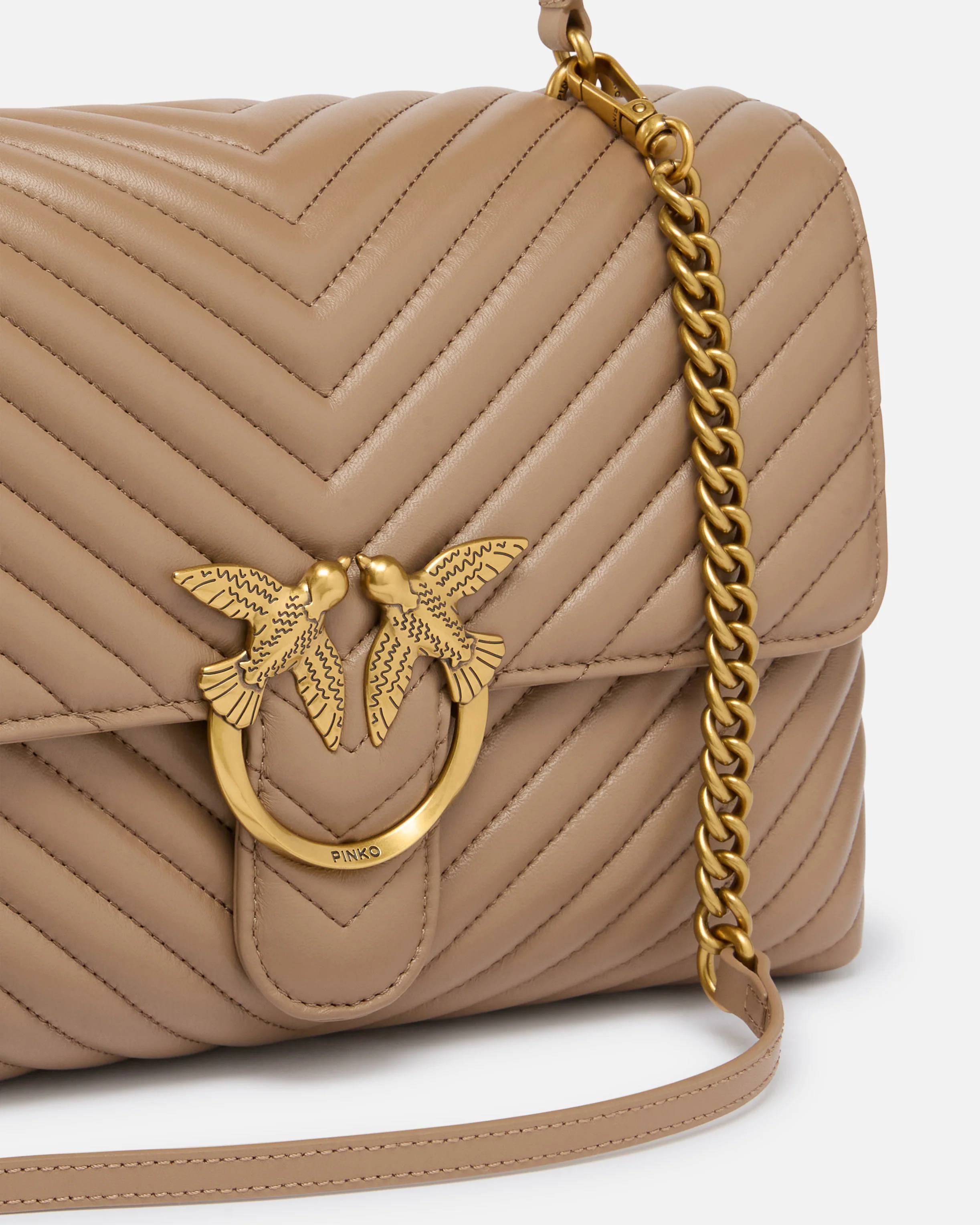 Big Love Bag Puff in quilted nappa leather with chevron pattern. The fastening is embellished with the iconic metal Love Birds Diamond Cut buckle. The accessory boasts a microsuede-lined interior, complete with a zipped centre divider pocket and slip pocket. The shoulder strap combines the classic round metal chain with a practical, adjustable nappa leather pad.