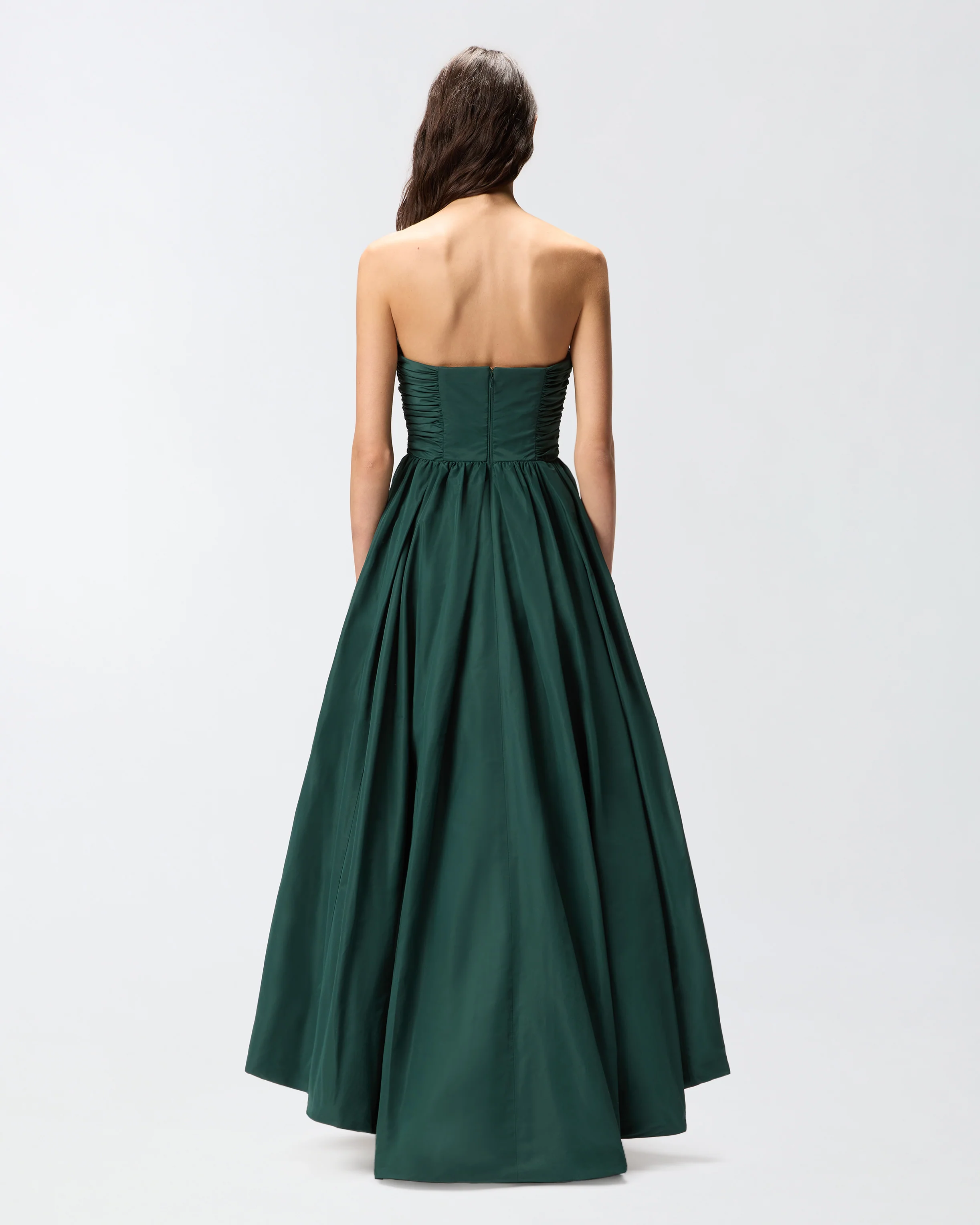 Long taffeta dress, fitted on top and flared on the skirt, with a zip on the back and an opening on the front. The material is light and shiny and blends perfectly with the dynamic-volume design that distinguishes the garment. The feminine line of the strapless bodice is enhanced by the shaped neckline and the ruffled detailing, while the inside of the cups has tape to prevent the dress from slipping. This elegant dress is perfect for wearing on special occasions, whether as an evening outfit or as a ceremony look.
